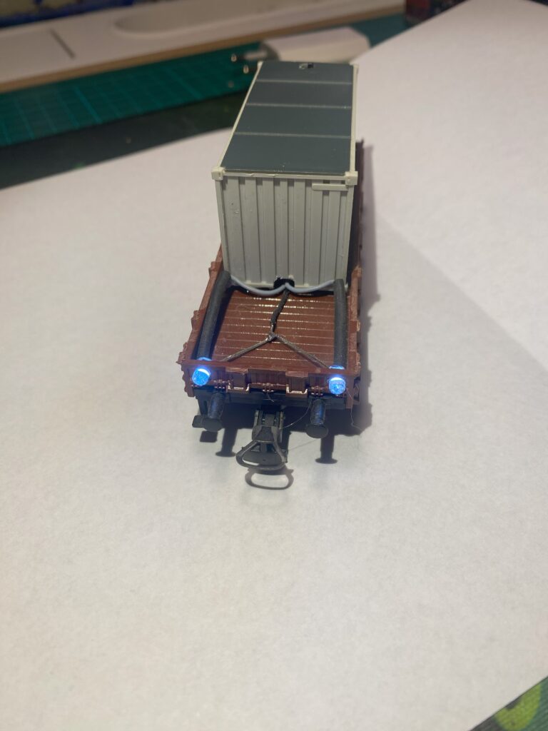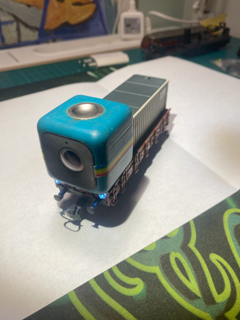 Vi har forsøgt os en del med videooptagelser under kørsel. Det startede med et ældre Märklin sæt med indbygget kamera og nogle specielle briller til at se med. Det fik vi slet ikke til at virke. Så bestilte vi nogle billige små kameraer fra Kina og satte på en fladvogn som blev skubbet af et lokomotiv. Funktionelt virkede det, men optage kvaliteten var ubrugelig. Torben fandt så et brugt Cube kamera på nettet og vi fik det hjem og sat på fladvognen. Det hjalp. Nu er kvaliteten i orden og kamera vognen blev sendt en tur rundt på banen. Desværre havde det problemer i mørke tunneler, optagelsen blev meget mørk. Så ombyggede vi fladvognen med et par lys dioder, en container og et 3V batteri, Det virker bare.